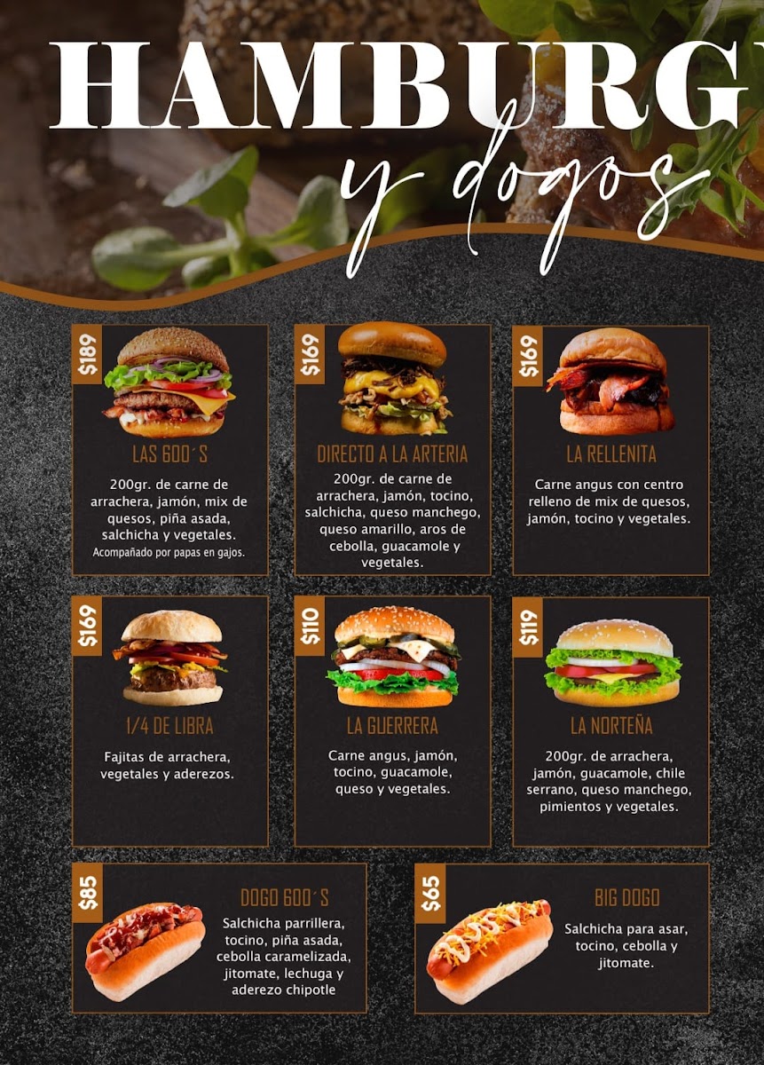 Hamburguesa con arrachera 200 gr, jamón, guacamole, chile serrano, queso manchego, pimientos, lechuga, tomate y cebolla.