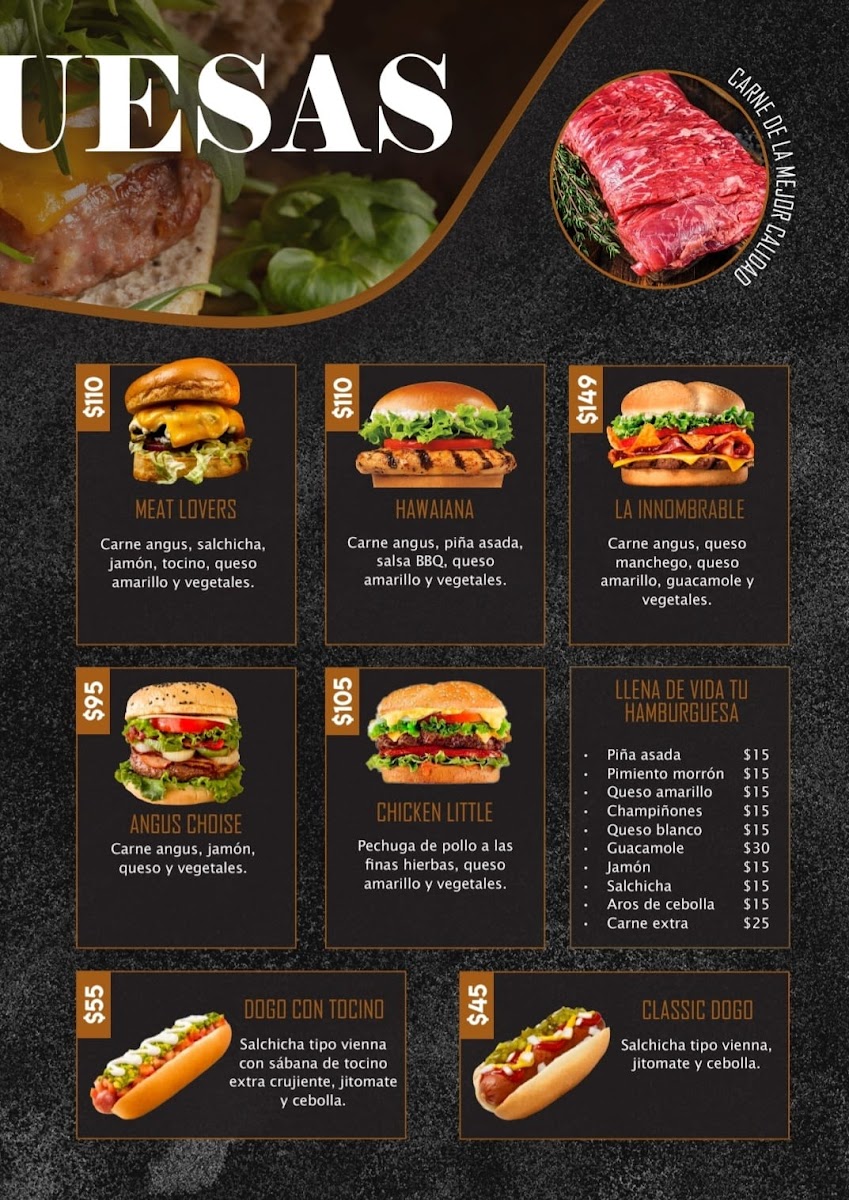 Hamburguesa con carne angus, queso manchego y amarillo, guacamole, lechuga, tomate y cebolla.